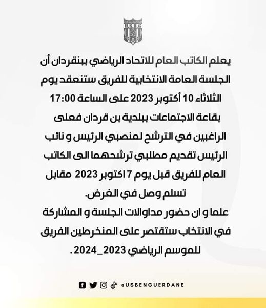 La direction de l'US Ben Guerdane a annoncé qu'une assemblée générale élective sera organisée au mois d'octobre.