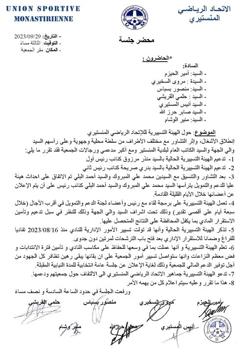 A la suite d'une réunion tenue aujourd'hui, le comité directeur provisoire de l'Union Sportive Monastirienne a décidé de poursuivre sa mission.
