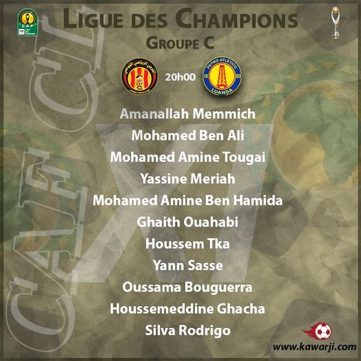 Suivez avec nous sur Kawarji à partir de 20h00 l'évolution du score de la rencontre de la troisième journée du groupe C en Ligue des Champions entre l'Espérance de Tunis et Petro Atlético :
