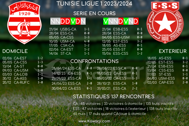 Avant la rencontre en retard prévue ce jeudi pour le compte de la 11ème journée de Ligue 1 tunisienne 2023-2024, voici l'historique et les statistiques relatifs à cette confrontation :