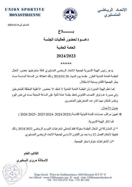 L'Union Sportive Monastirienne a communiqué aujourd'hui la date de son assemblée générale ordinaire.