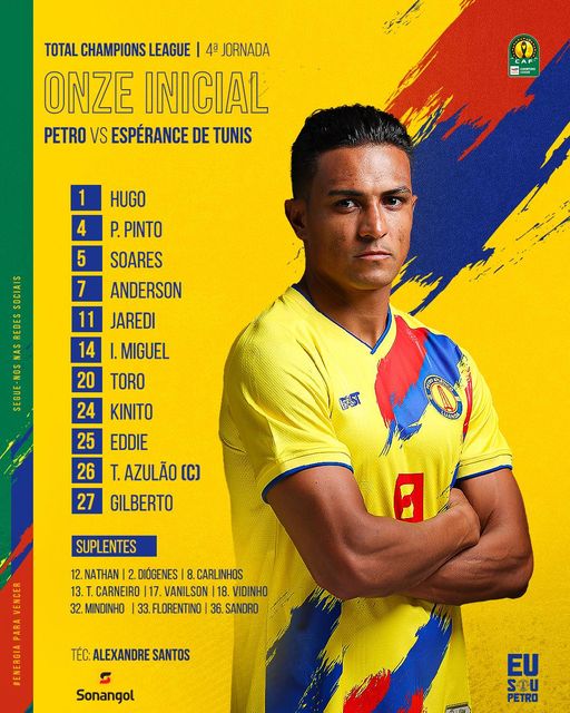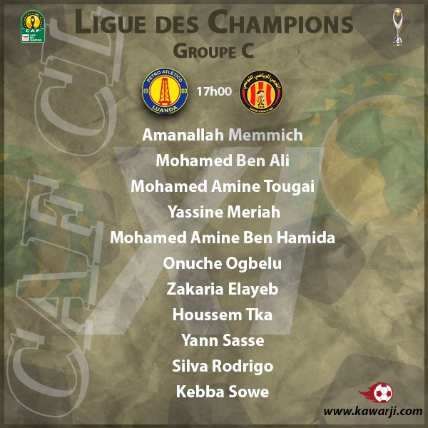 Suivez avec nous sur Kawarji à partir de 17h00 l'évolution du score de la rencontre de la quatrième journée du groupe C en Ligue des Champions entre Petro Atlético et l'Espérance de Tunis :