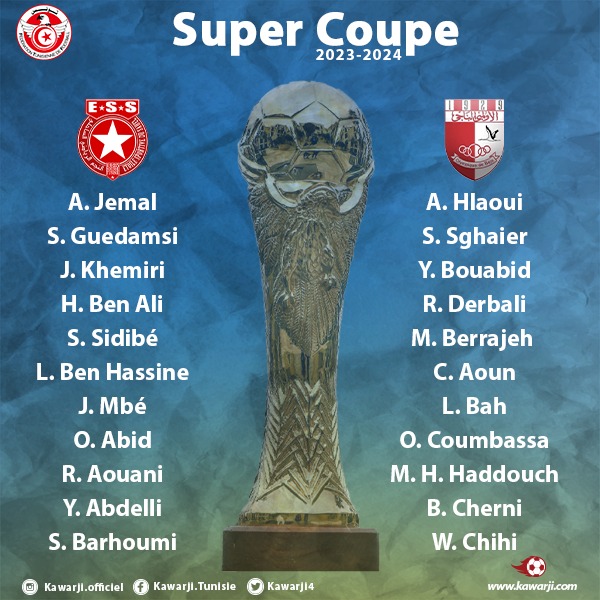 Suivez avec nous sur Kawarji à partir de 16h00 l'évolution du score de la finale de la Super Coupe de Tunisie 2022-2023 qui opposera l'Etoile Sportive du Sahel à l'Olympique de Béja :
