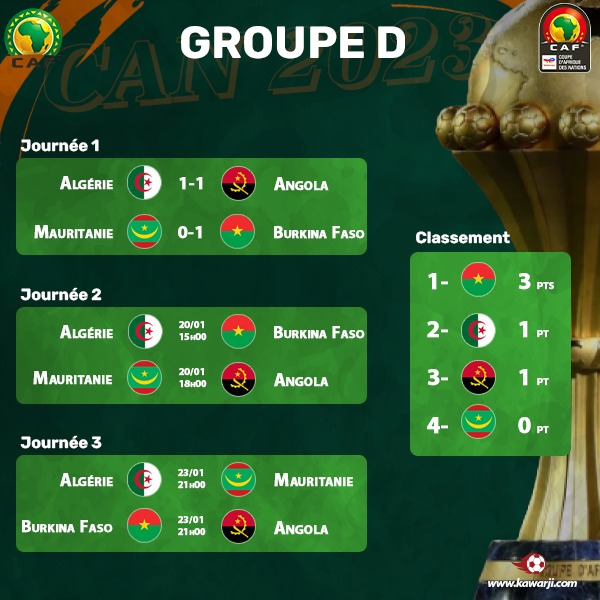 Classement : Burkina Faso 3 pts, Algérie 1 pt, Angola 1 pt, Mauritanie 0 pt