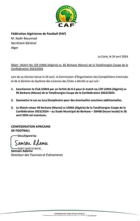 Selon plusieurs sources, la Confédération Africaine de Football a communiqué aujourd'hui sa décision au sujet de la rencontre des demi-finales aller de la Coupe de la Confédération qui devrait opposer dimanche dernier l'USM Alger à la RS Berkane.