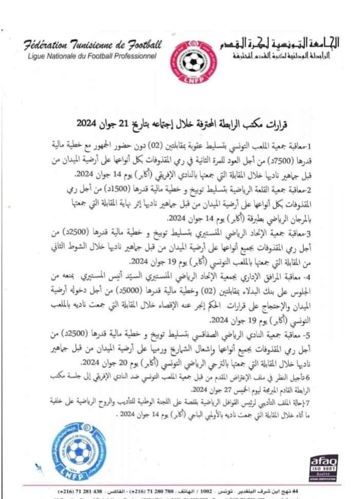 La Ligue Nationale de Football Professionnel a décidé aujourd'hui de reporter son verdict dans la réclamation du Stade Tunisien contre le Club Africain.