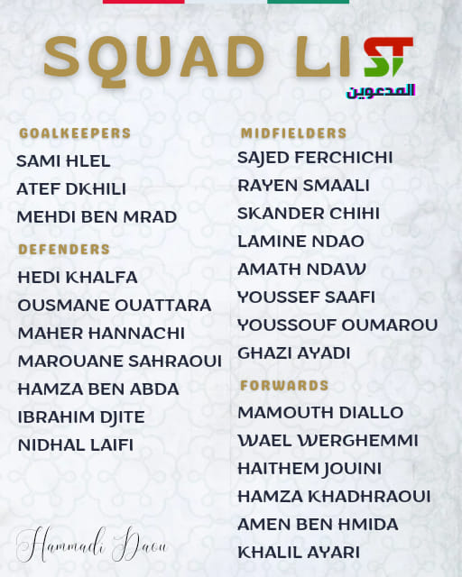 Voici la liste des joueurs du Stade Tunisien convoqués pour disputer demain au stade Chedly Zouiten à partir de 16h00 la demi-finale de la Coupe de Tunisie face à l'Olympique de Béja :