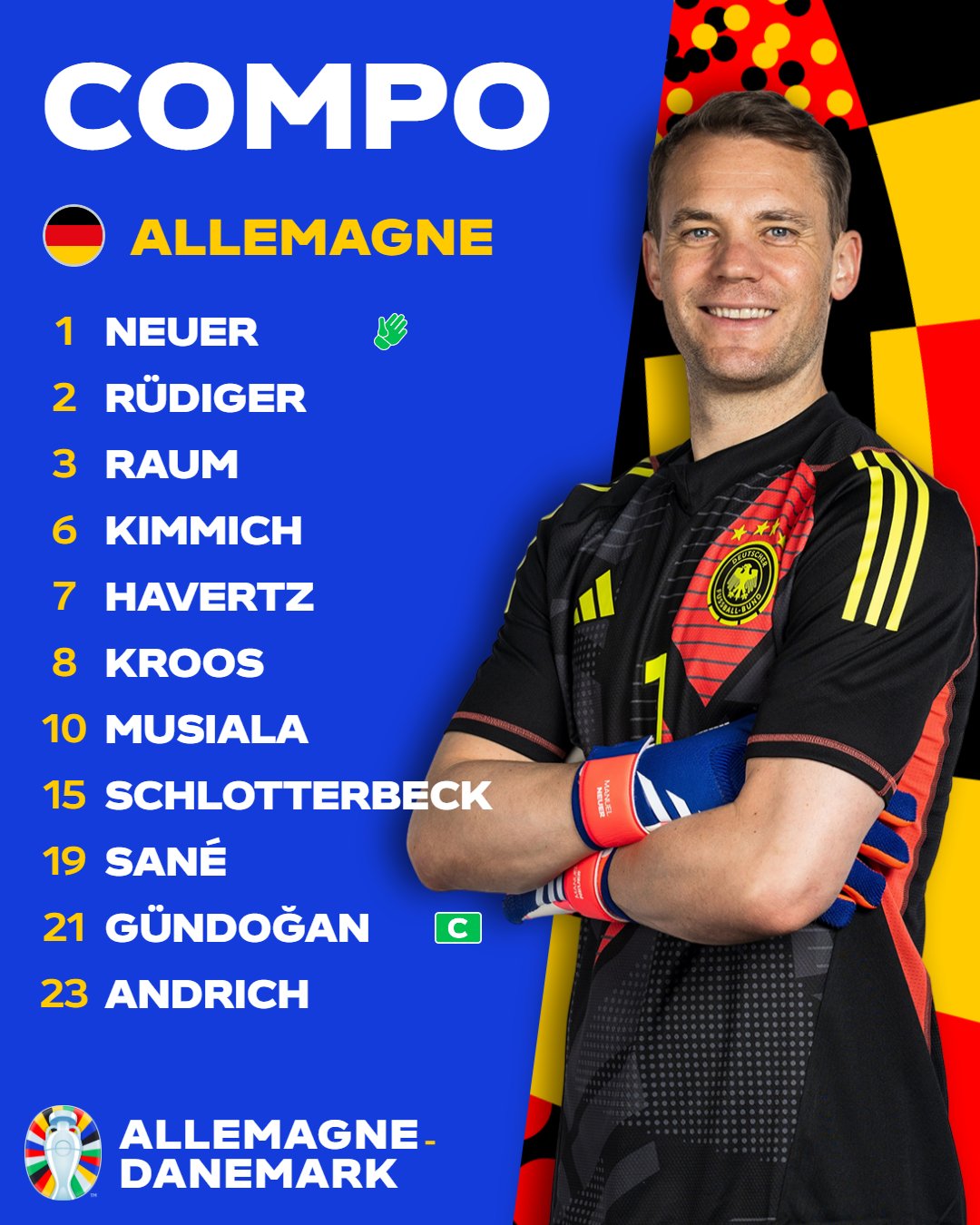 Suivez avec nous sur Kawarji à partir de 20h00 l'évolution du score du huitième de finale de l'Euro 2024 entre l'Allemagne et le Danemark :