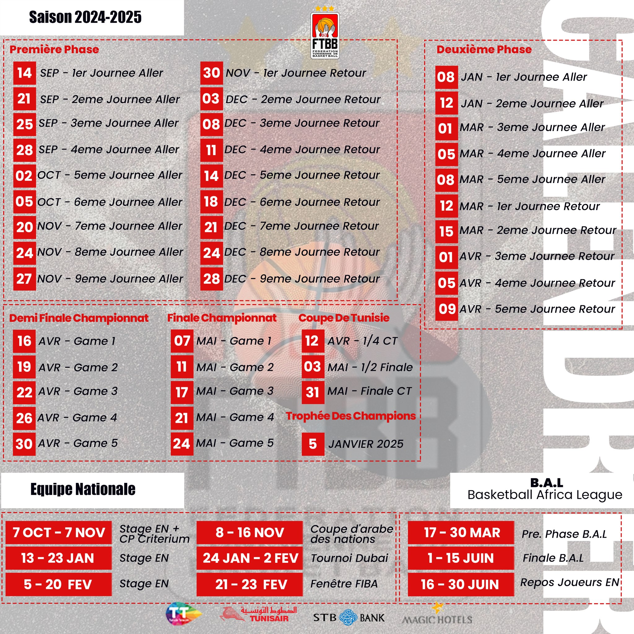 La Fédération Tunisienne de Basket-ball a communiqué le calendrier complet de la saison 2024-2025.