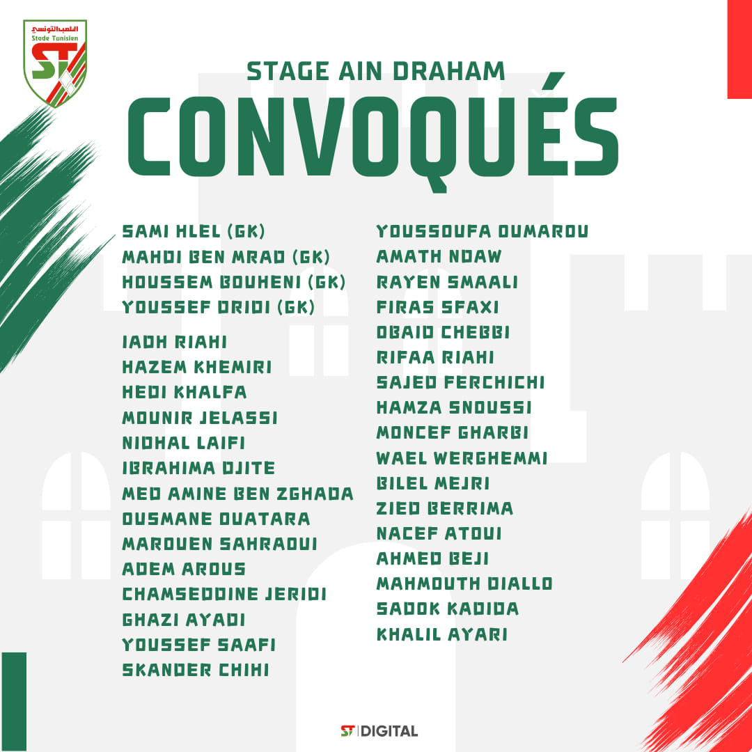 Le staff technique du Stade Tunisien a communiqué la liste des joueurs convoqués pour le stage de préparation de Ain Draham :