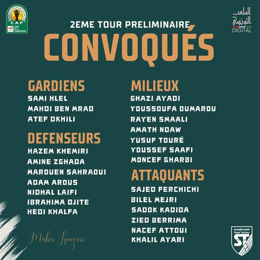 Voici la liste des joueurs du Stade Tunisien convoqués en vue du match de ce samedi (19h00) au second tour aller de la Coupe de la Confédération face à l'USM Alger :