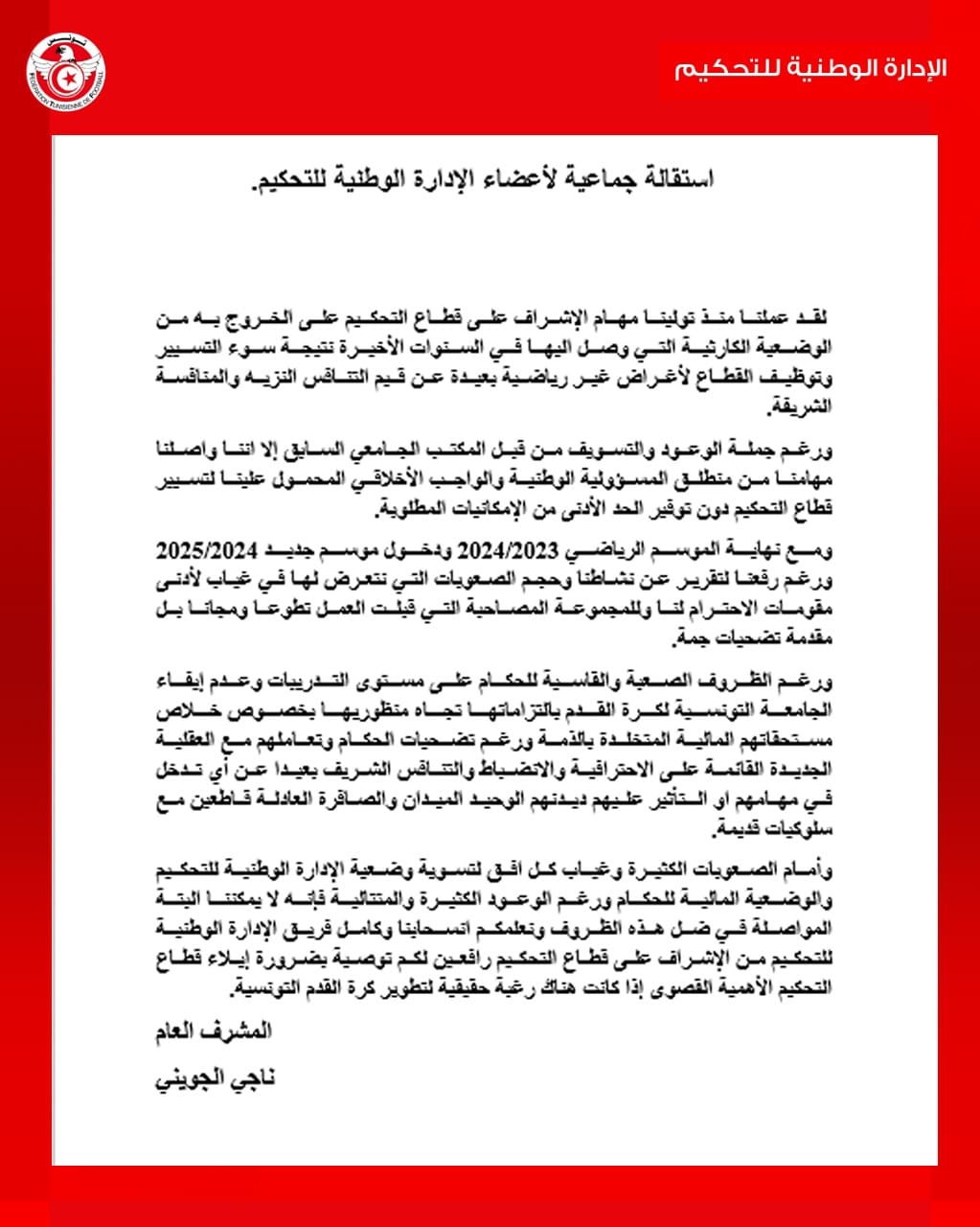 Hier, tous les membres de la Direction Nationale d'Arbitrage, et à leur tête Neji Jouini, avaient démissionné de leurs postes.