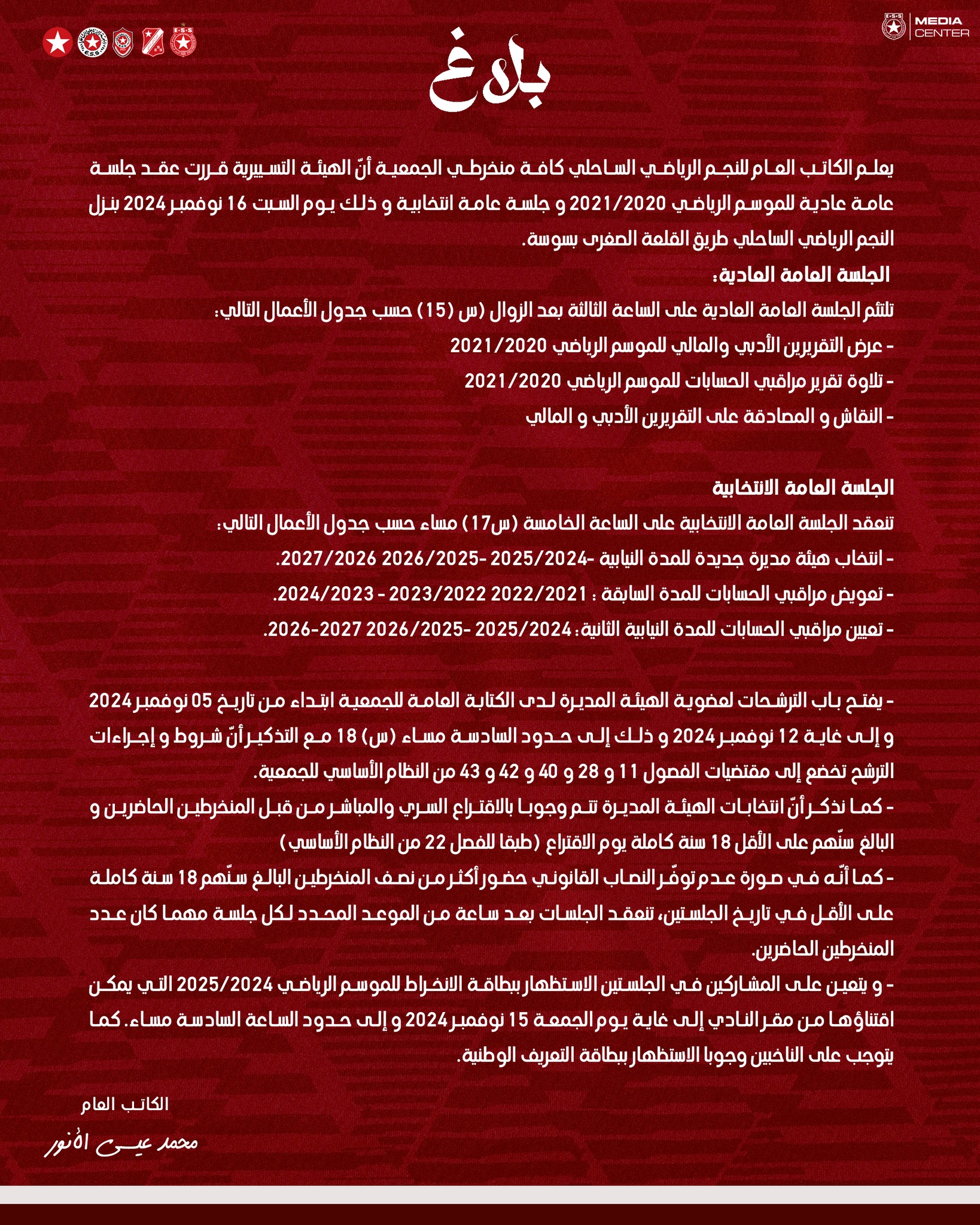 L'Etoile Sportive du Sahel a communiqué aujourd'hui la date de ses assemblées générales ordinaire et élective.