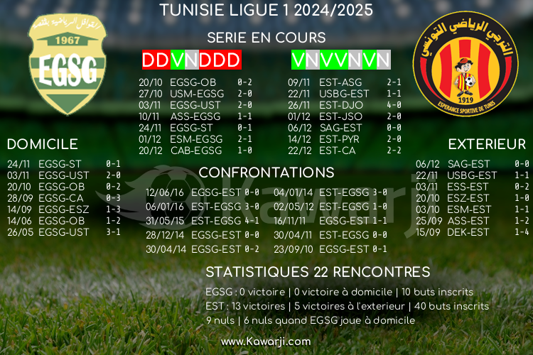 Avant la rencontre prévue ce mercredi entre l'EGS Gafsa et l'Espérance de Tunis pour le compte de la 11ème journée en Ligue 1 tunisienne 2024-2025, voici l'historique et les statistiques relatifs à cette confrontation :