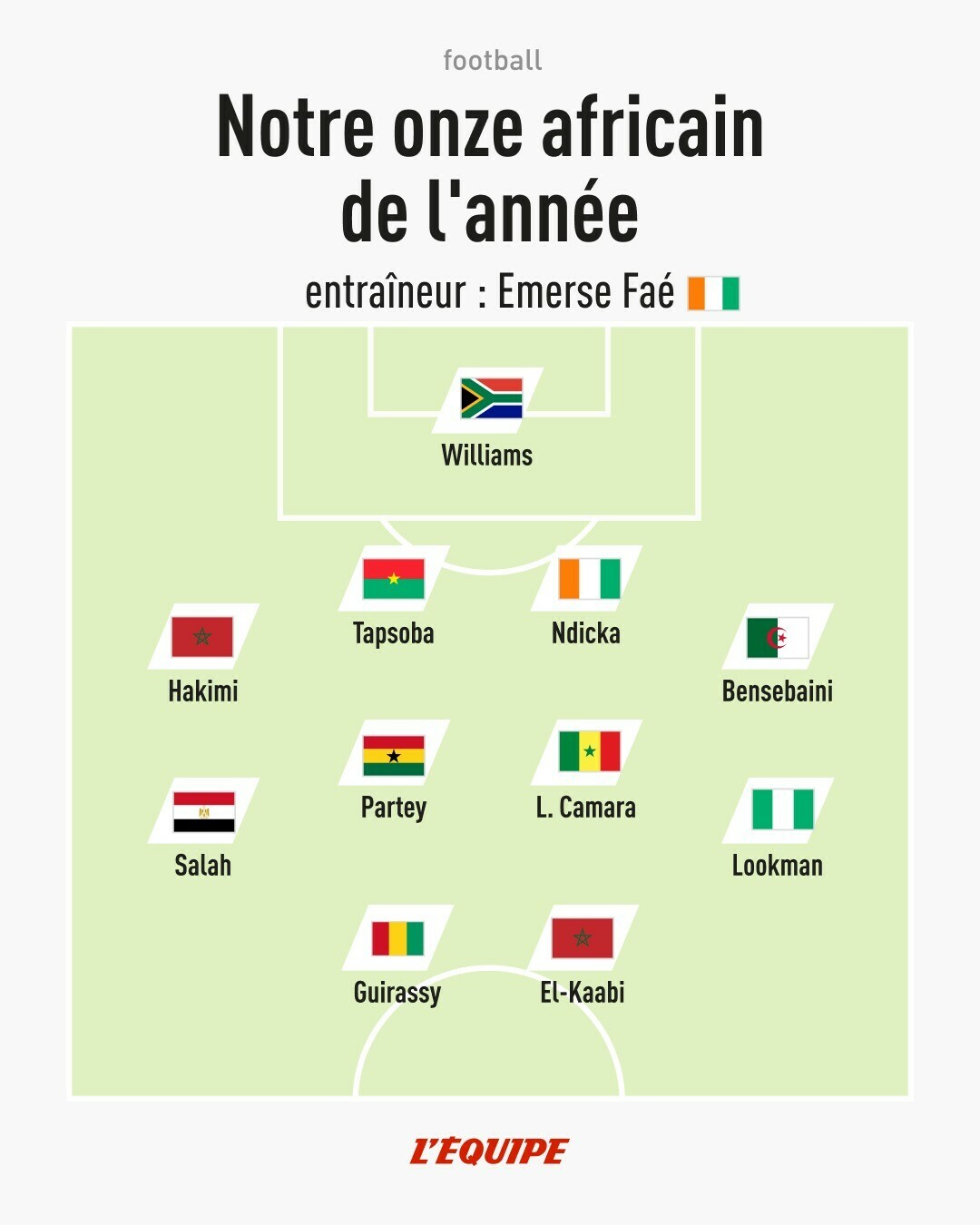 Choisie par les journalistes de l'Equipe, cette équipe est composée de Ronwen Williams (Afrique du Sud/Mamelodi Sundowns), Achraf Hakimi (Maroc/Paris-SG), Edmond Tapsoba (Burkina Faso/Bayer Leverkusen), Evan Ndicka (Côte d'Ivoire/AS Rome), Ramy Bensebaïni (Algérie/Borussia Dortmund), Thomas Partey (Ghana/Arsenal), Lamine Camara (Sénégal/AS Monaco), Ademola Lookman (Nigeria/Atalanta), Serhou Guirassy (Guinée/Borussia Dortmund) et Ayoub El Kaabi (Maroc/Olympiakos).