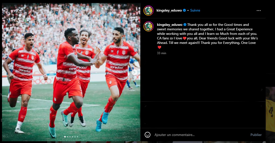 L'attaquant nigérian Kingsley Eduwo a annoncé aujourd'hui la fin de son aventure avec le Club Africain.