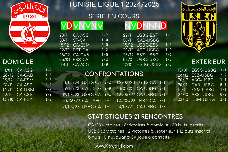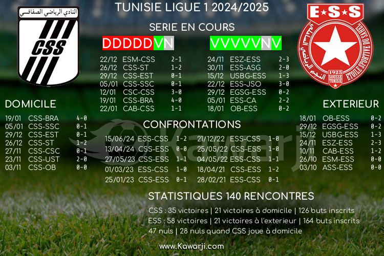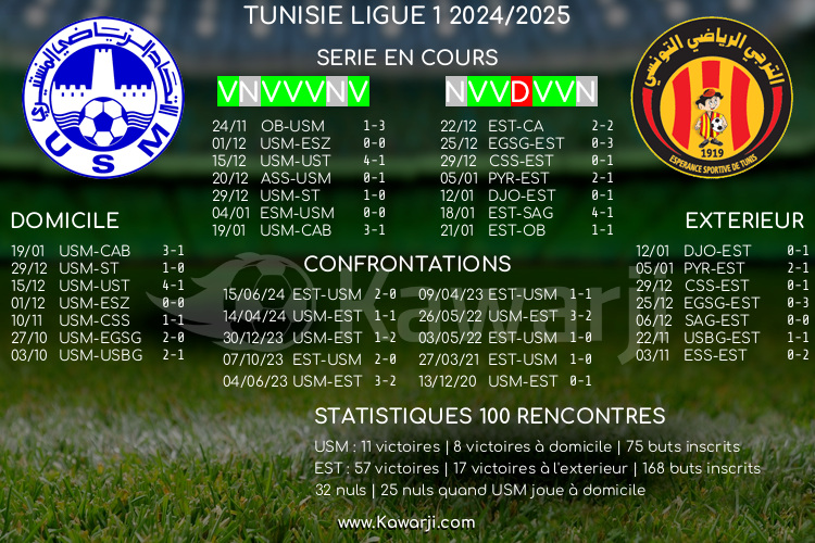 Avant les rencontres prévues ce dimanche pour le compte des 15ème et 16ème journées de Ligue 1 tunisienne 2024-2025, voici l'historique et les statistiques relatifs à ces confrontations :