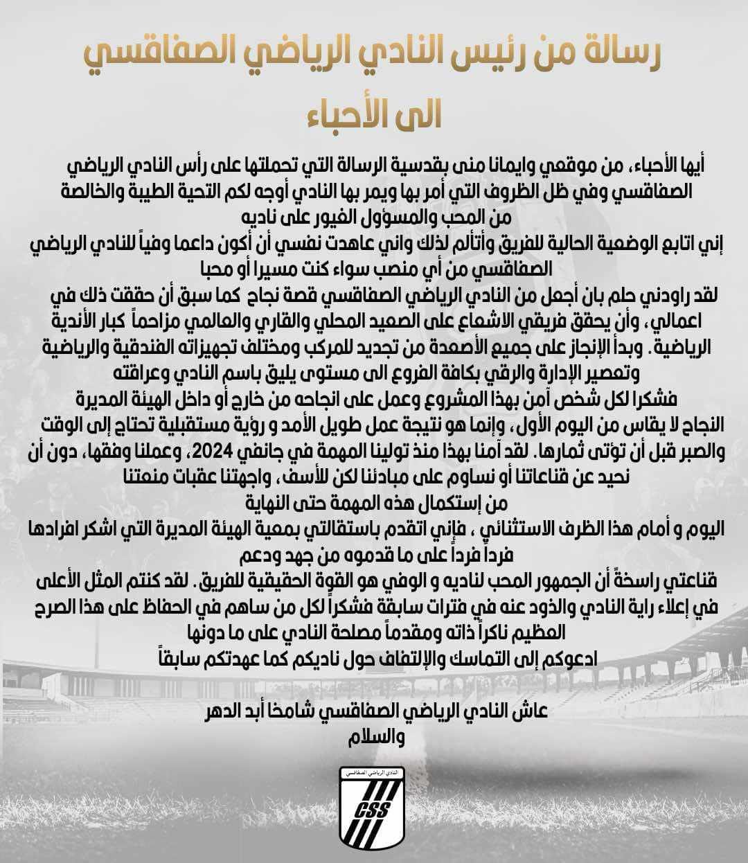 Une direction provisoire devrait être nommée à la tête de la formation sfaxienne dans les prochaines heures afin de gérer les affaires courantes et convoquer une nouvelle assemblée générale élective.