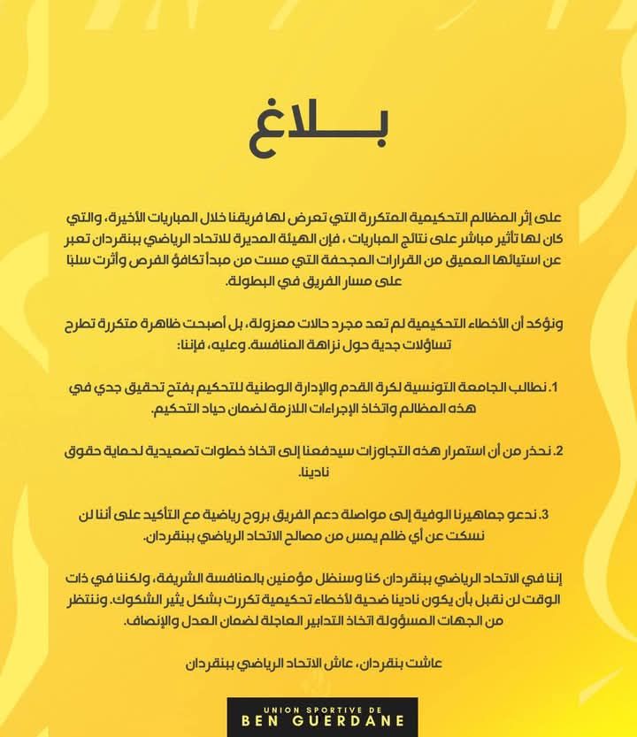 Le comité directeur de l'US Ben Guerdane a publié un communiqué pour se plaindre de l'arbitrage.