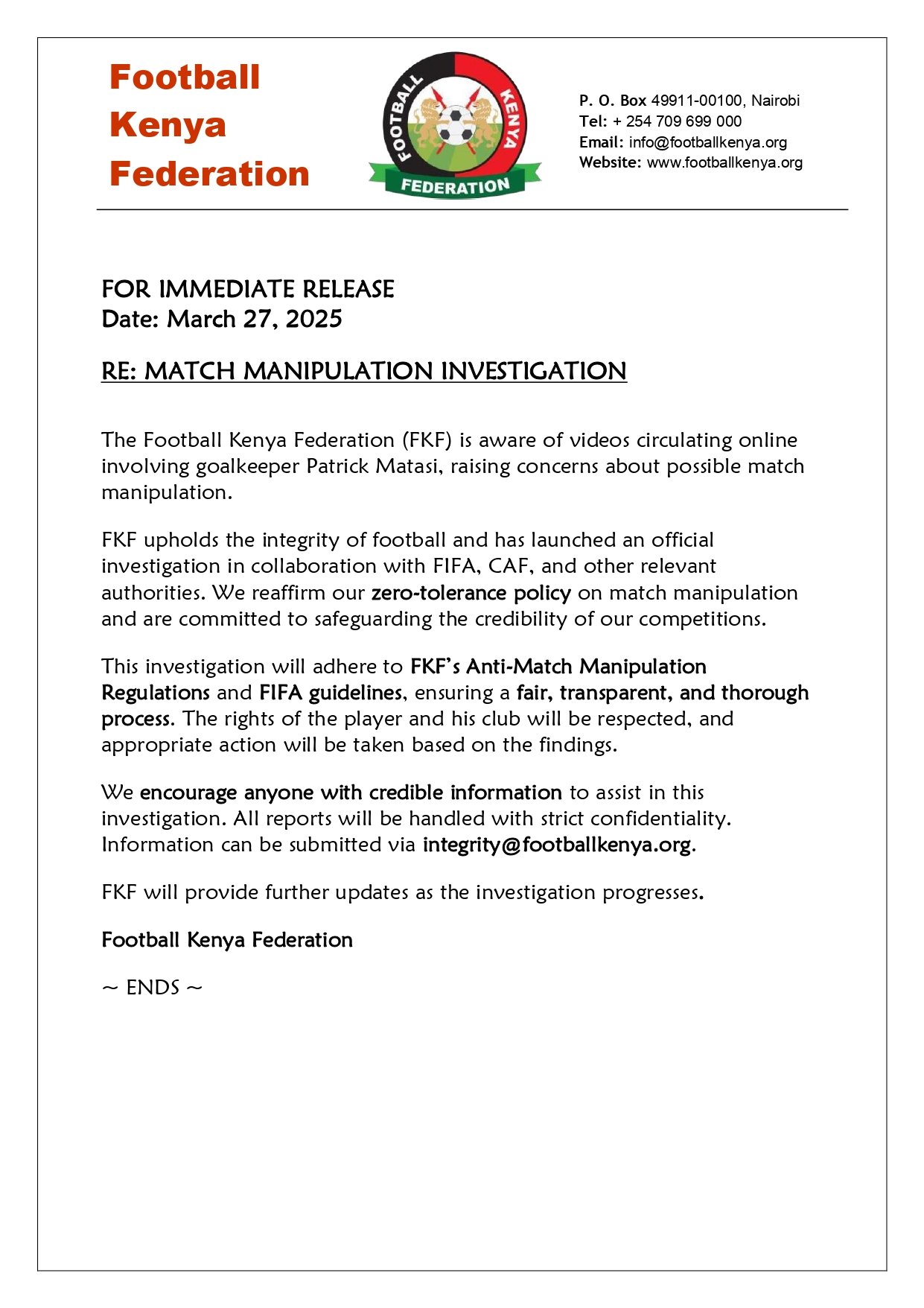 La Fédération Kenyane de Football a décidé d'ouvrir une enquête en collaboration avec la FIFA et la Confédération Africaine de Football concernant des soupçons de trucage après un match perdu par la sélection kenyane en qualifications pour la Coupe d'Afrique des Nations 2025.
