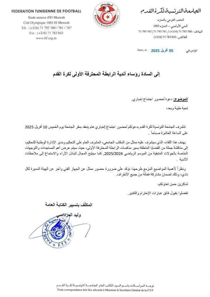 La Fédération Tunisienne de Football a programmé une réunion avec des représentants des clubs de la Ligue 1 cette semaine.