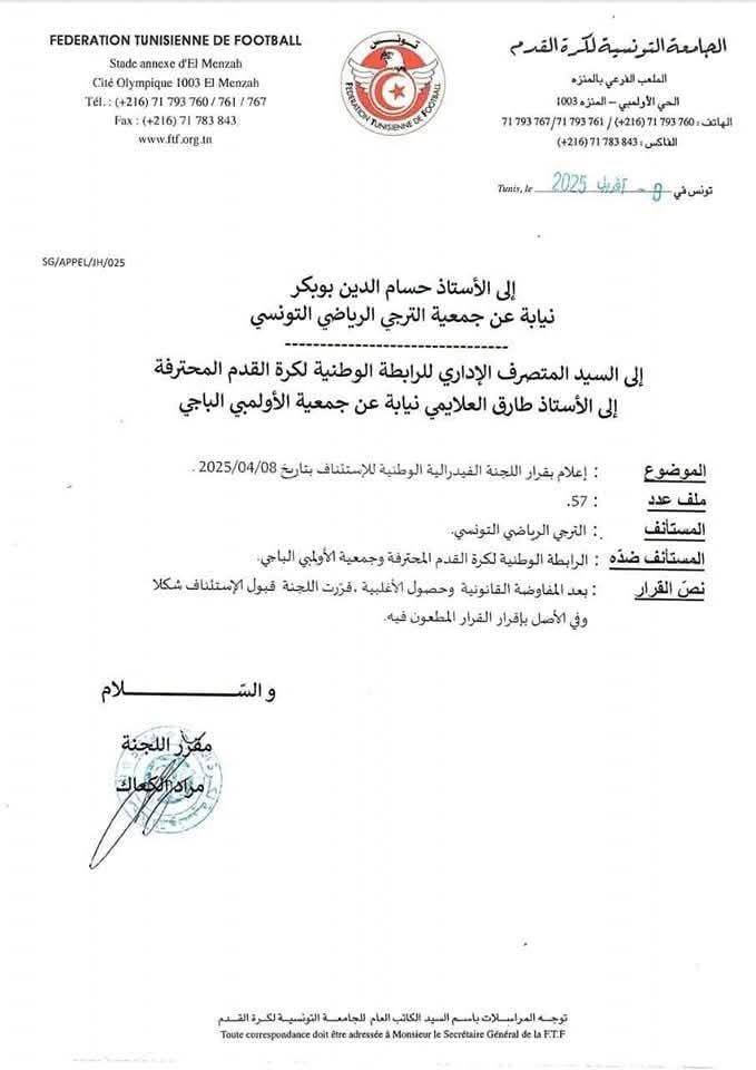 La commission nationale d'appel de la Fédération Tunisienne de Football a communiqué ce soir sa décision dans le dossier qui oppose l'Espérance Sportive de Tunis à l'Olympique de Béja.