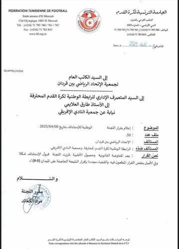 La commission nationale d'appel de la Fédération Tunisienne de Football a cassé aujourd'hui la décision de la Ligue Nationale de Football Professionnel au sujet de la rencontre entre le Club Africain et l'US Ben Guerdane.