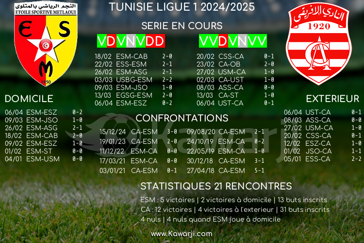 Avant les rencontres prévues ce samedi pour le compte de la 26ème journée de Ligue 1 tunisienne 2024-2025, voici l'historique de ces confrontations :