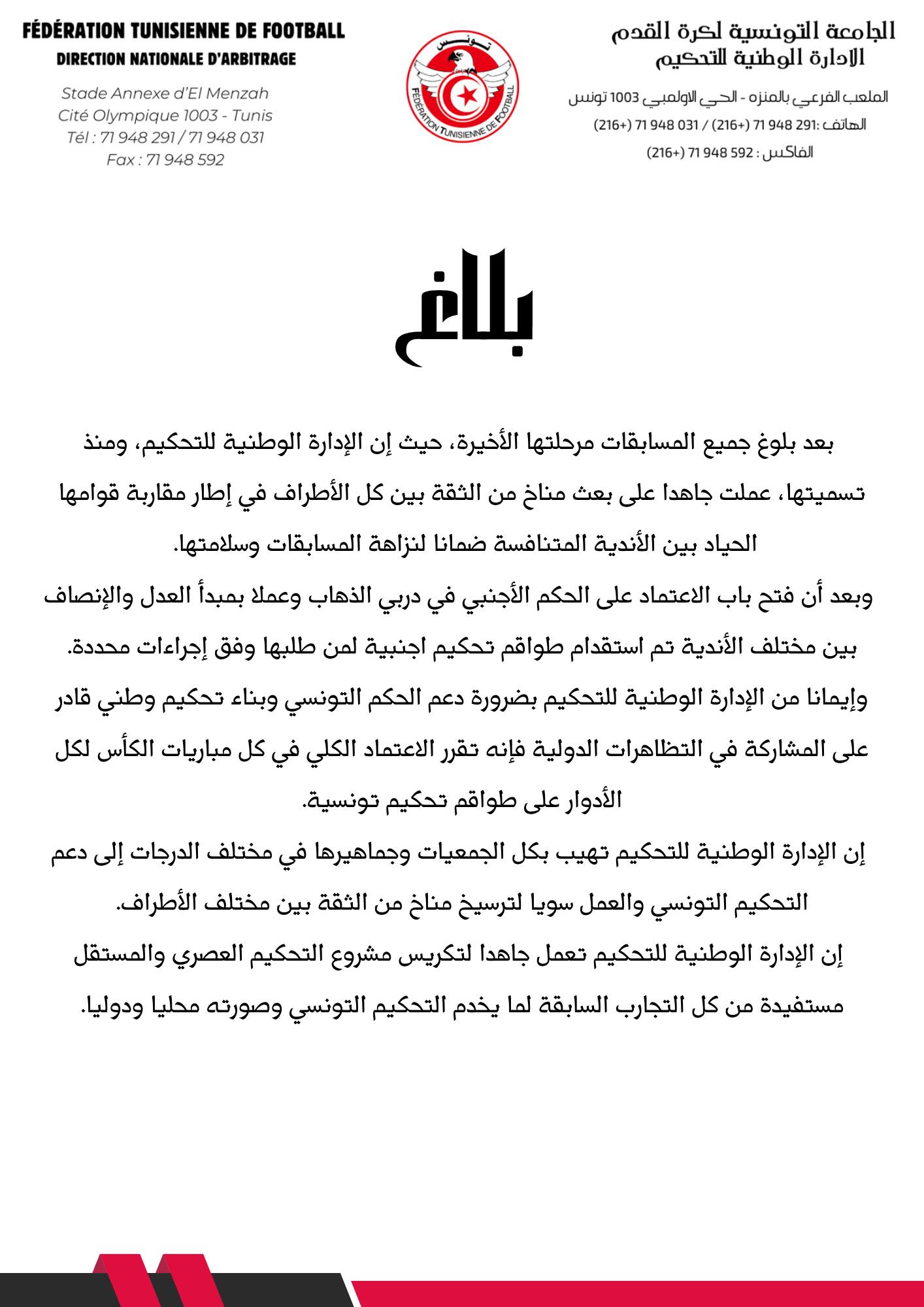 La Direction Nationale de l'Arbitrage a publié aujourd'hui un communiqué au sujet des arbitres des matches de la Coupe de Tunisie.