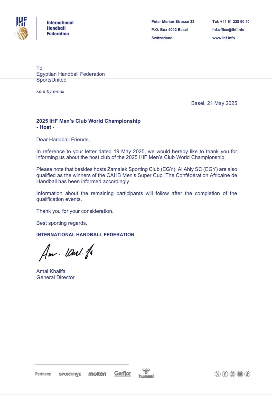 La Fédération Internationale de Handball a accepté la requête de la Fédération Egyptienne concernant les équipes qui seront présentes à la Coupe du Monde des Clubs 2025.