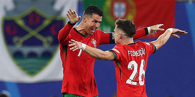 Peu après l’ouverture du score, le Portugal réagit avec force. A la 26ème minute, Nuno Mendes égalise d’une superbe frappe croisée (1-1). Les débats s’équilibrent alors, les deux équipes proposant un jeu offensif attrayant.