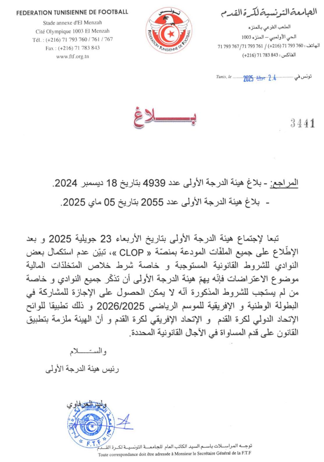 La Fédération Tunisienne de Football a publié aujourd'hui un communiqué à destination des clubs.