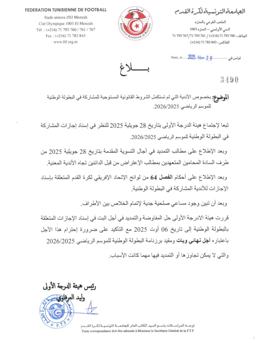 La Commission de la Première Division, chargée de l’octroi des licences de participation au championnat pour la saison sportive 2025-2026, a décidé d'accorder un délai supplémentaire aux clubs.