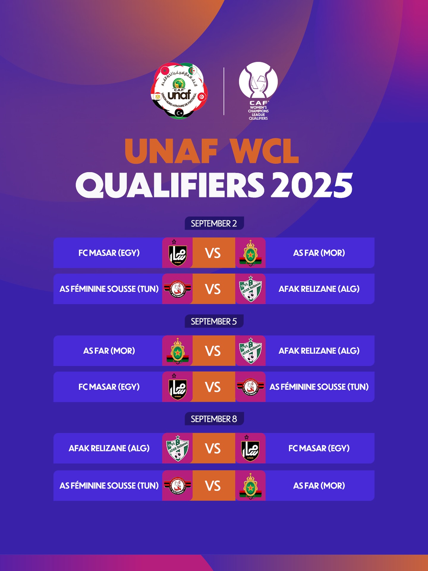 L'Union Nord-Africaine de Football (UNAF) a communiqué aujourd'hui le programme détaillé des matches de la zone Afrique du Nord en qualifications pour la Ligue des Champions Africaine féminine 2025.