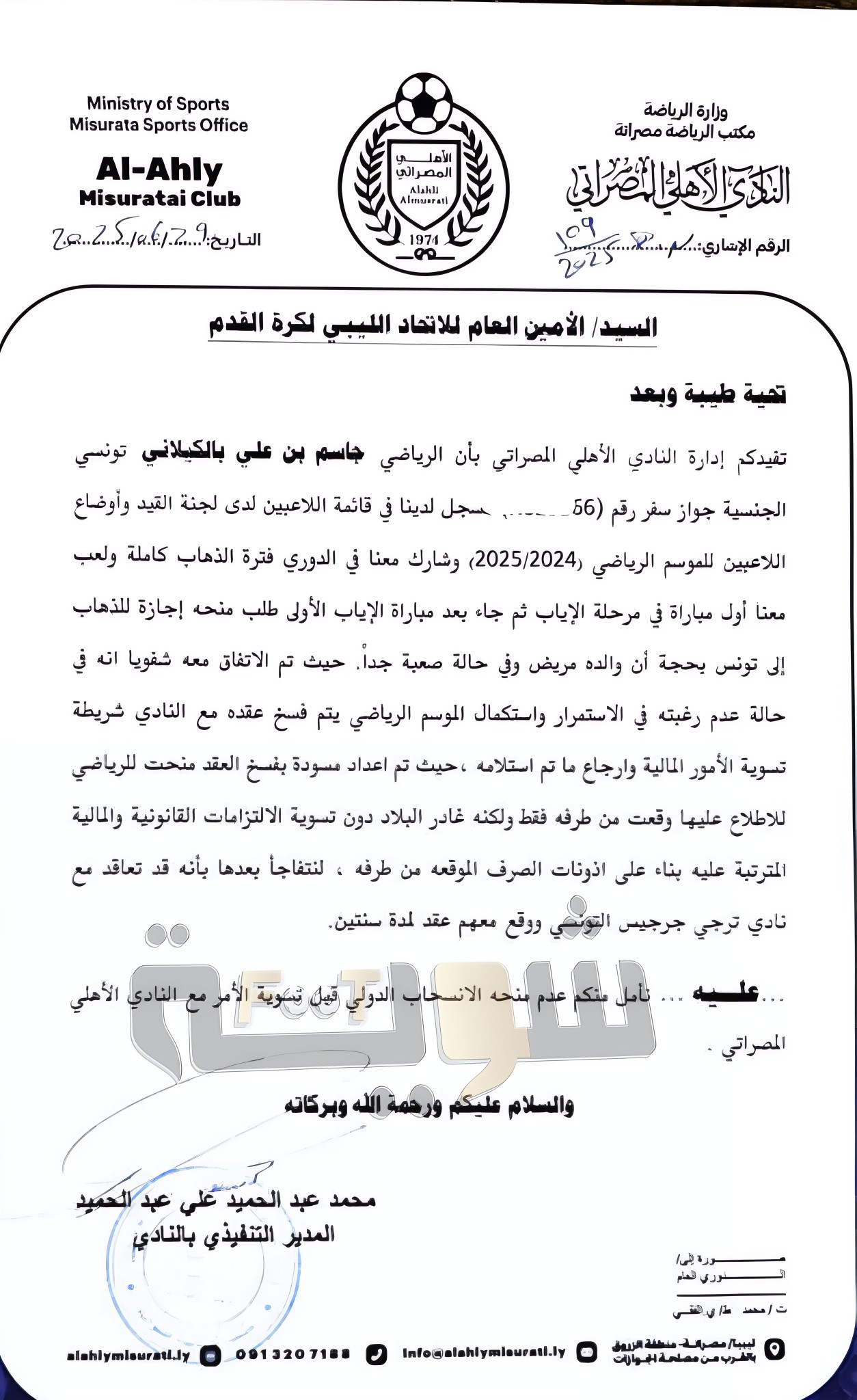La formation libyenne d'Al Ahli Al Musrati aurait indiqué que ce joueur était encore lié avec elle avant de rompre unilatéralement son contrat.