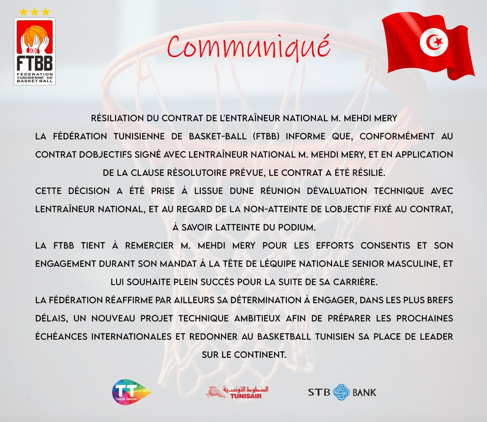 La Fédération Tunisienne de Basket-ball a annoncé aujourd'hui la résiliation du contrat du sélectionneur Mehdi Mery.