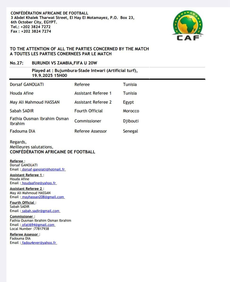 La Confédération Africaine de Football a désigné des arbitres tunisiennes pour la rencontre des éliminatoires africaines de la Coupe du Monde des moins de 20 ans entre le Burundi et la Zambie.