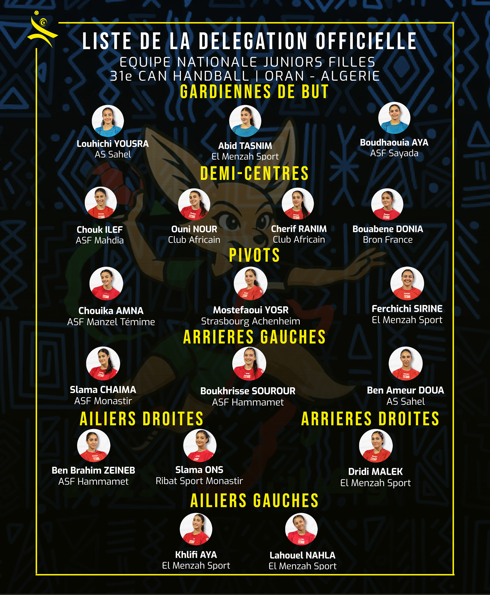 La Fédération Tunisienne de Handball a communiqué la liste des joueuses convoquées pour la Coupe d'Afrique Féminine Juniors des Nations de Handball.