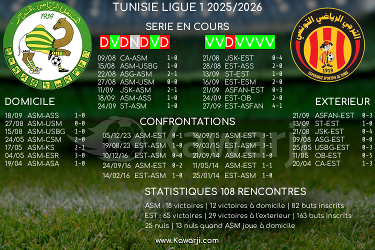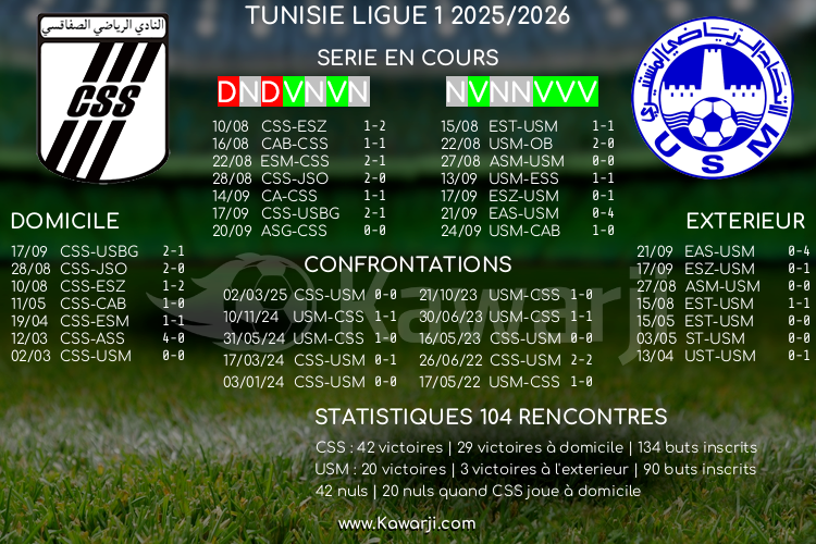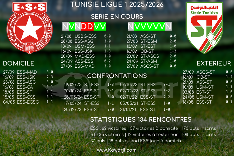 Avant les rencontres prévues ce mercredi pour le compte de la 8ème journée de Ligue 1 tunisienne 2025-2026, voici l'historique de ces confrontations en championnat :