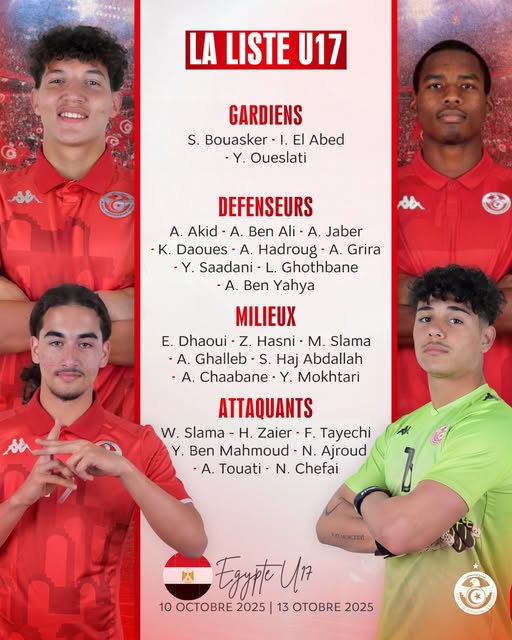 La sélection tunisienne des moins de 17 ans disputera au mois d'octobre deux rencontres amicales.