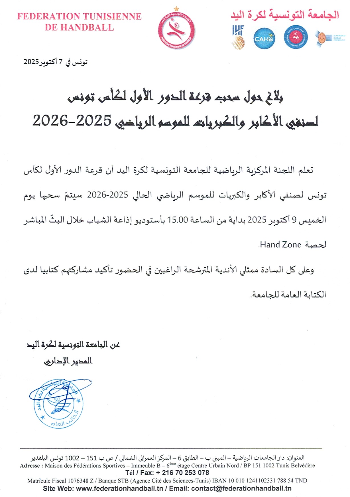 La Fédération Tunisienne de Handball a communiqué la date du tirage du premier tour de la Coupe de Tunisie.
