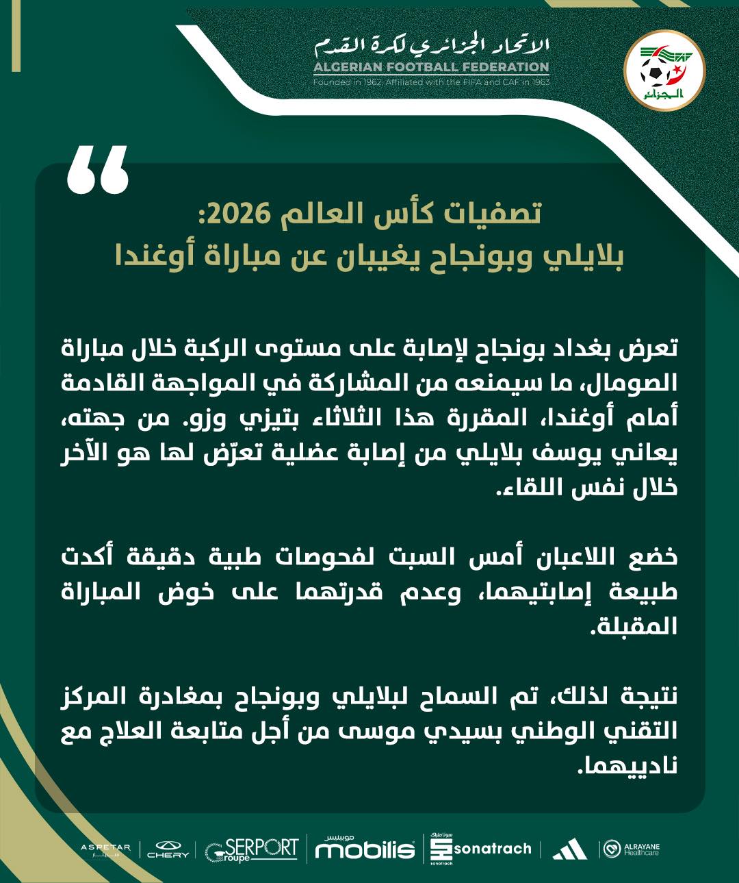 La Fédération Algérienne de Football a annoncé aujourd'hui l'absence de Youcef Belaili du dernier match de la sélection en éliminatoires de la Coupe du Monde 2026.