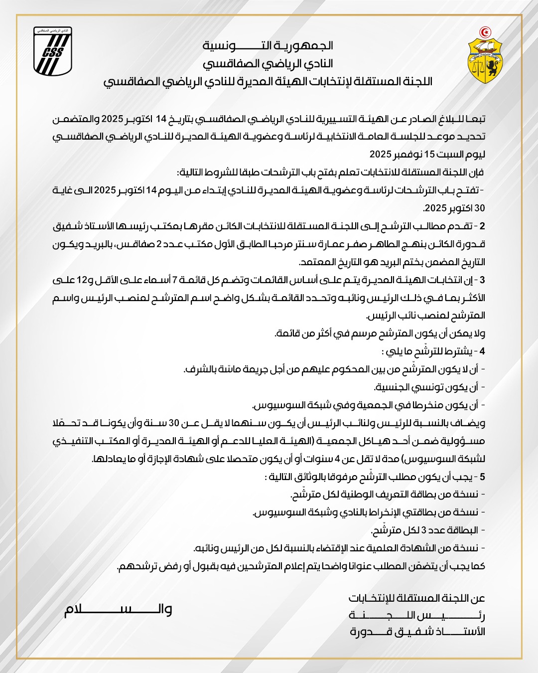 Le Club Sportif Sfaxien tiendra sa prochaine assemblée générale élective au mois de novembre.