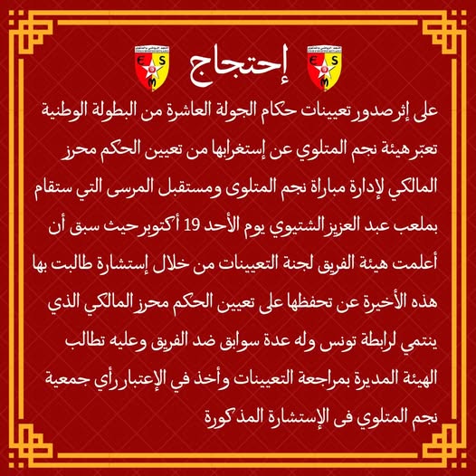 L’ES Métlaoui a publié un communiqué à la suite de l’annonce des désignations arbitrales pour la 10ème journée de Ligue 1 par la Direction Nationale de l’Arbitrage.