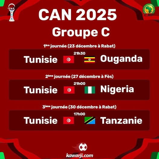 Voici le programme des matches du groupe de la sélection tunisienne au premier tour de la Coupe d'Afrique des Nations 2025 au Maroc :