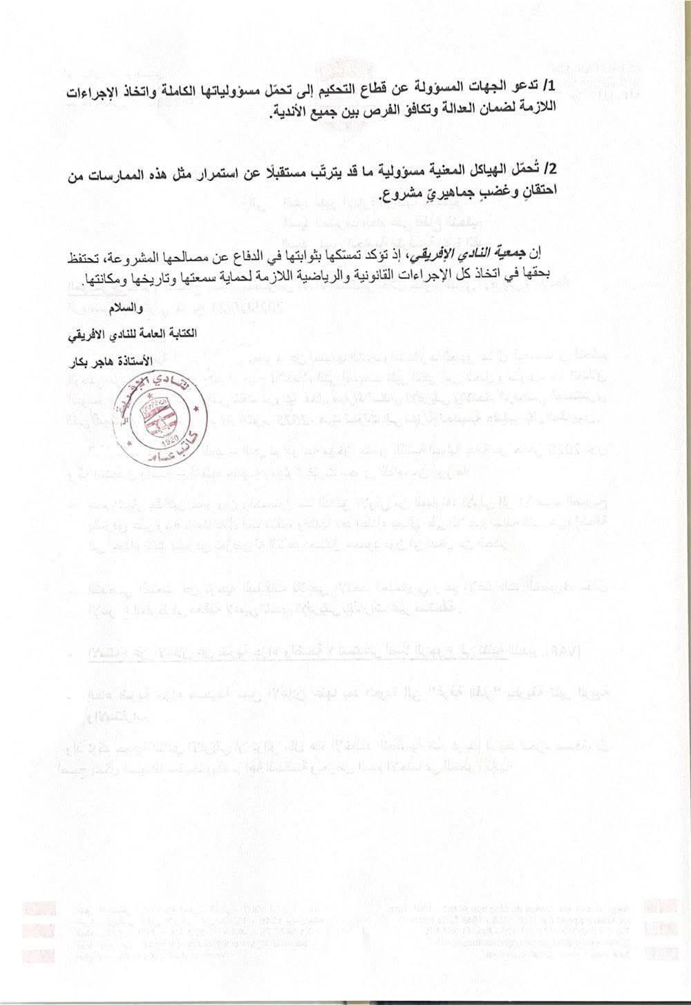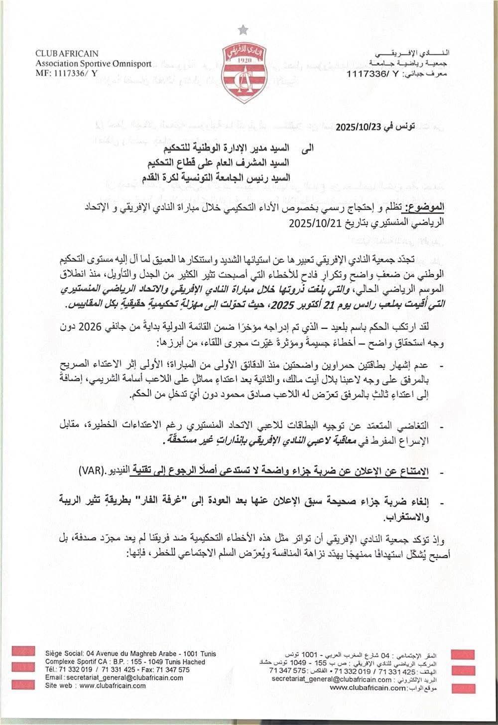 La direction du Club Africain a envoyé une correspondance à la Direction Nationale de l'Arbitrage pour se plaindre de la prestation de l'arbitre Bacem Belaid.
