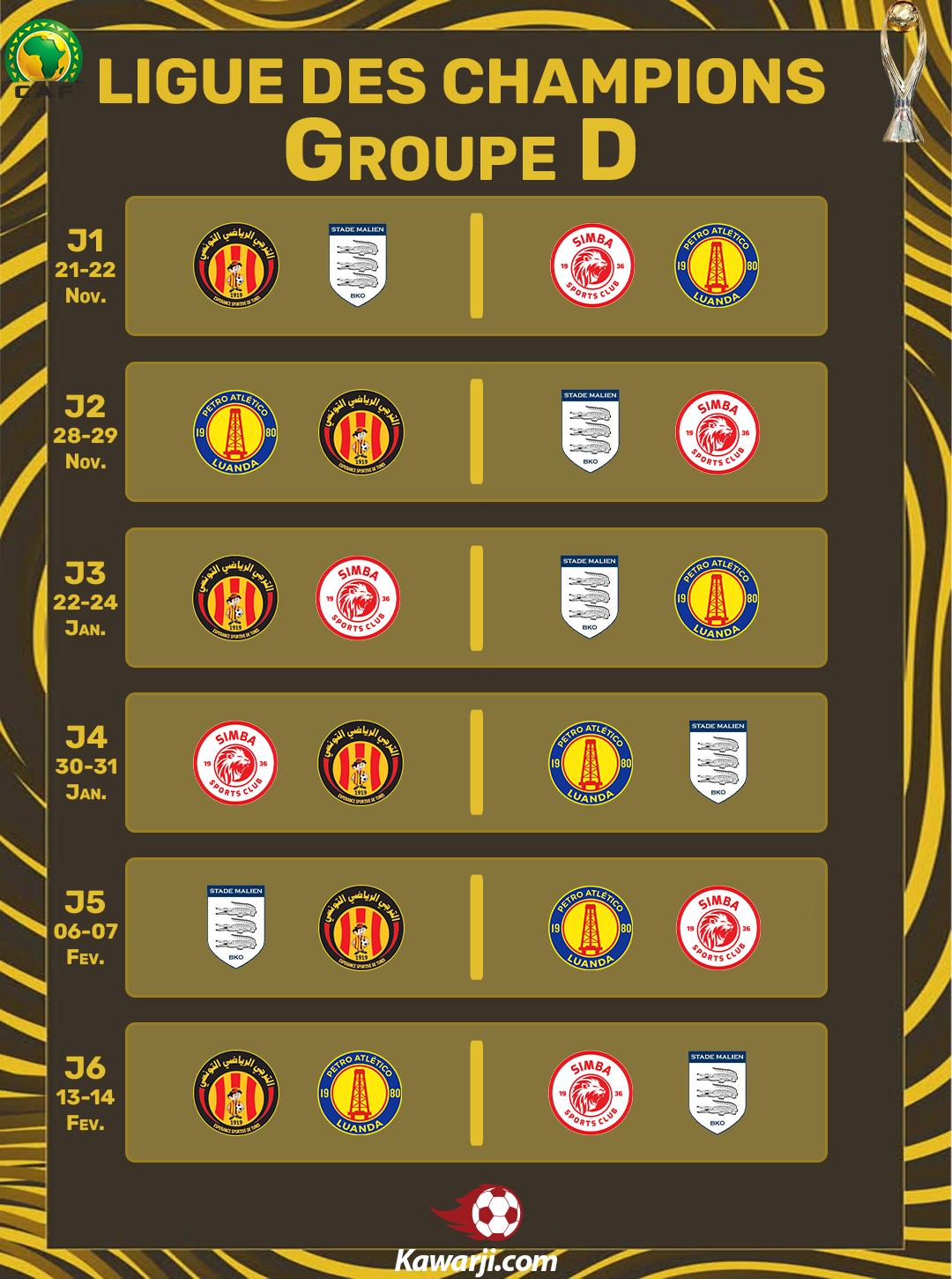 Voici le programme des matches de l'Espérance Sportive de Tunis en phase de poules de la Ligue des Champions africaine :