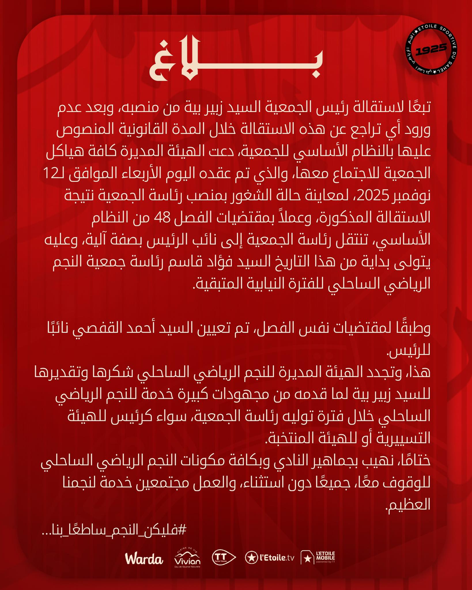 A la suite de la réunion de la direction de la formation étoilée, Foued Kacem a été choisi pour occuper le poste de président et aura Ahmed Gafsi comme vice-président.