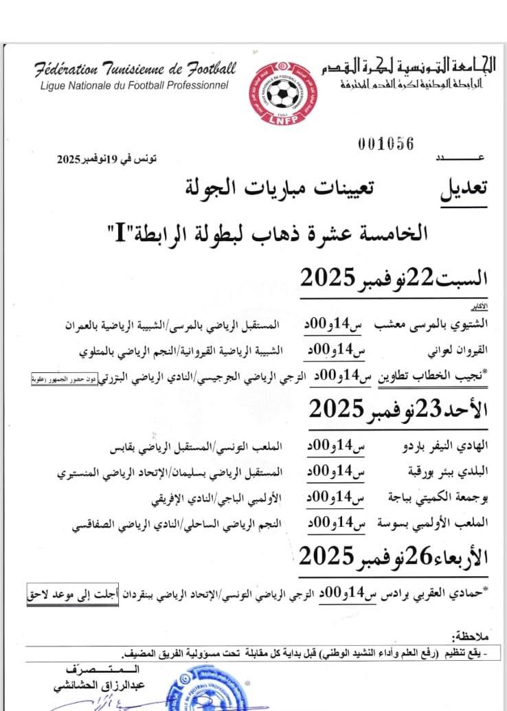 La Ligue Nationale de Football Professionnel a annoncé aujourd'hui le report de la rencontre de Ligue 1 entre l'Espérance Sportive de Tunis et l'US Ben Guerdane.