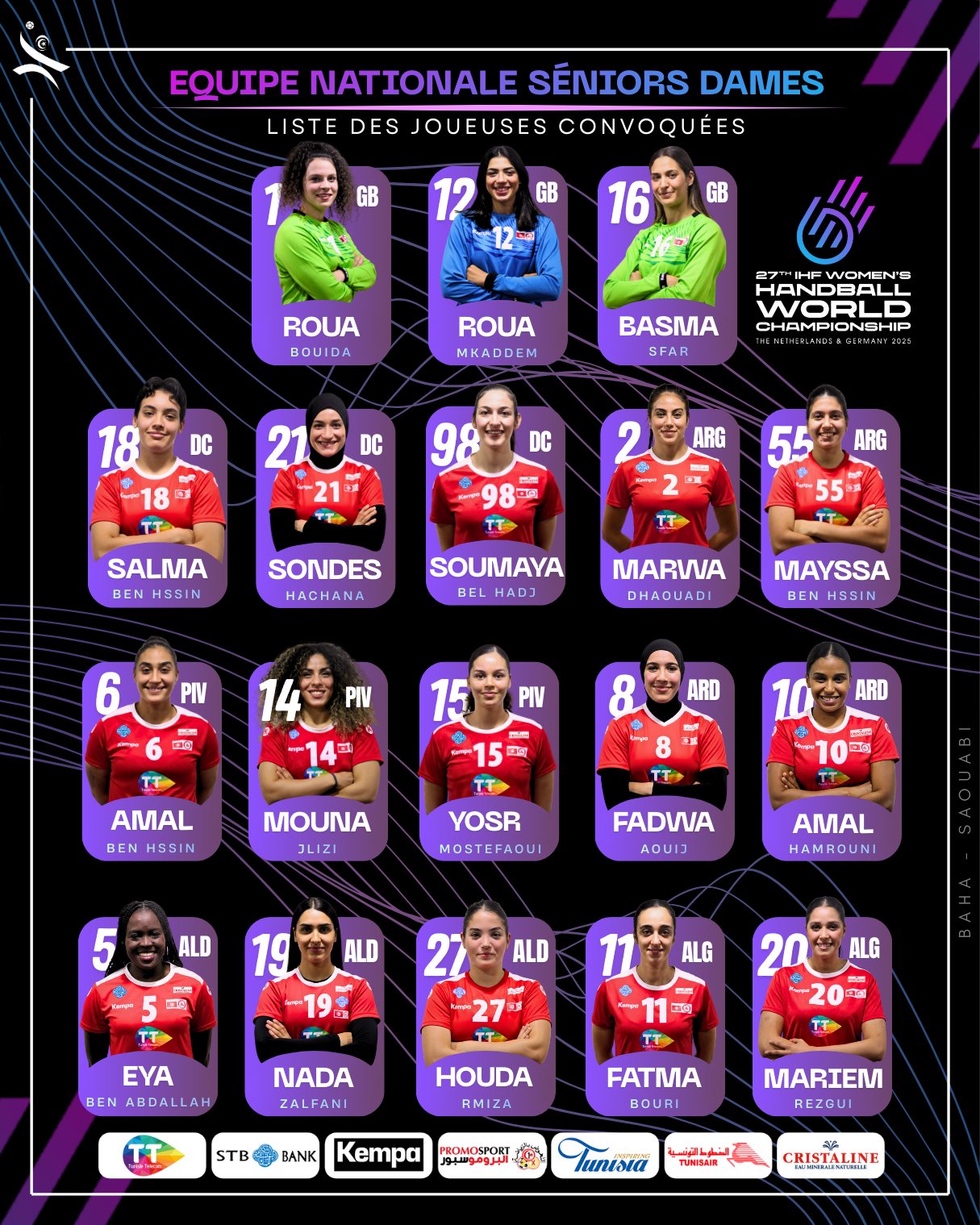 La Fédération Tunisienne de Handball a communiqué la liste finale des joueuses de la sélection tunisienne féminine qui disputeront le Championnat du Monde 2025.